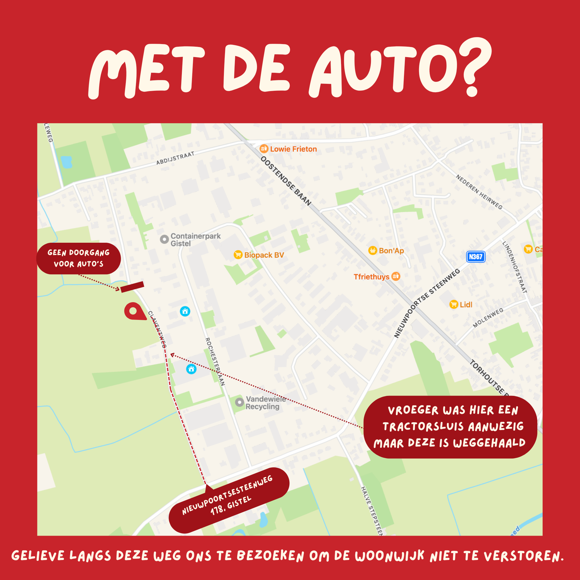 Wij raden aan om in de gps het adres ‘Nieuwpoortse steenweg 178, Gistel’ in te voeren en dan de Claventweg (een klein boerenbaantje) te volgen tot u onze grote tent ziet staan. Zie afbeelding onderaan.